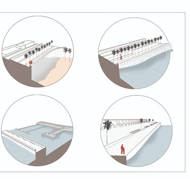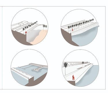 In this redesign, we aim to preserve part of the area known as ‘Los Cubos’, which is recognized for its popular use. As we approach the Club Mediterráneo, we propose greater spatial and programmatic continuity through open spaces designed for rest and contemplation, encouraging enjoyment of the coastal environment in its natural state. The height differentiation will be maintained by incorporating a beach-style tiered structure, without interfering with the sense of continuity and direct contact with the river, fostering a greater sense of belonging to the place and making the waterfront a more vibrant and visited area.