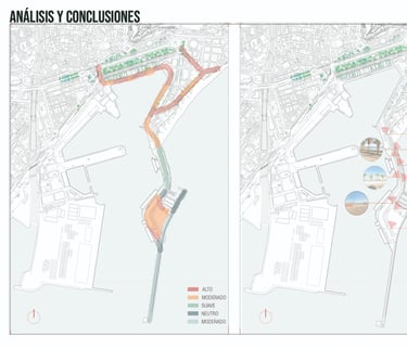 Regarding the area adjacent to the Club Mediterráneo and near the cruise terminal, we propose a revitalization of the space to improve the flow of pedestrian traffic along this coastal strip, which is currently obstructed by a series of misplaced structural elements aligned along the promenade. We will relocate the port-related functions to the opposite side, thereby freeing up space for an area more integrated with the coastal environment.