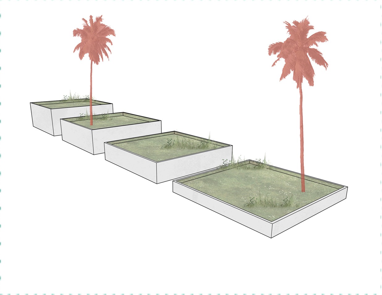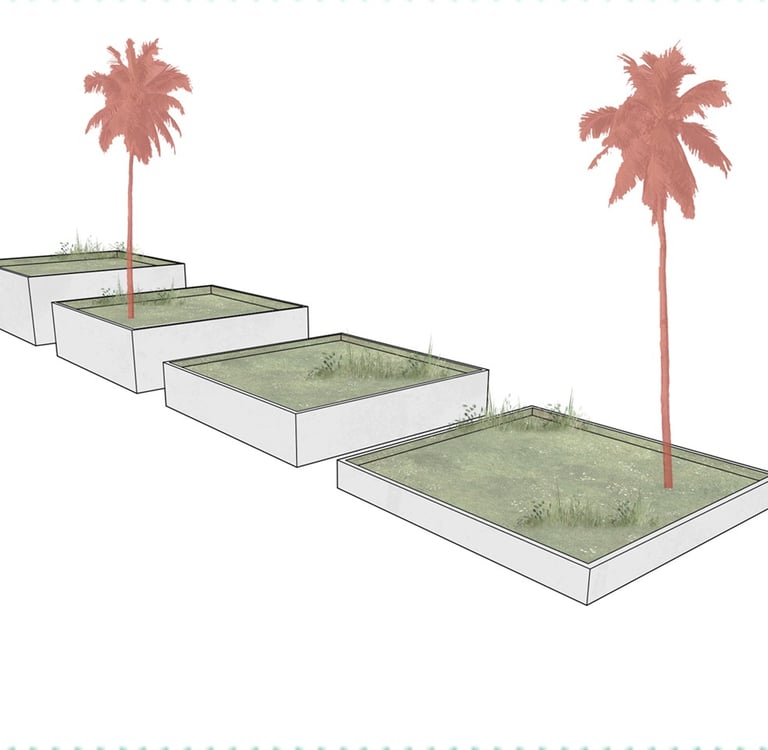 A square-shaped model measuring 10x10 meters. These models increase in height in a stepped manner. They are constructed with reinforced and prefabricated concrete, and each one features a green roof with vegetation on its surface. The variation in height creates a stepped effect, enabling an interesting distribution of space and vegetation across different levels, with a 1-meter height difference between each.