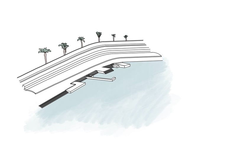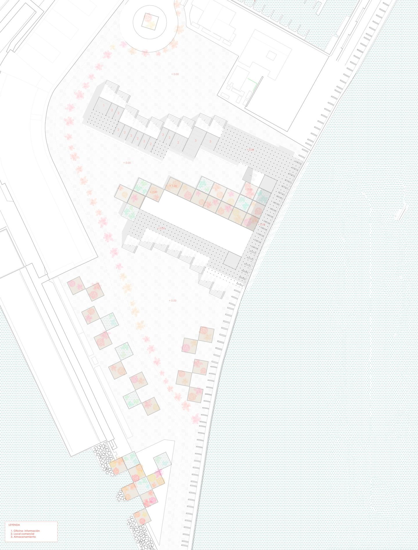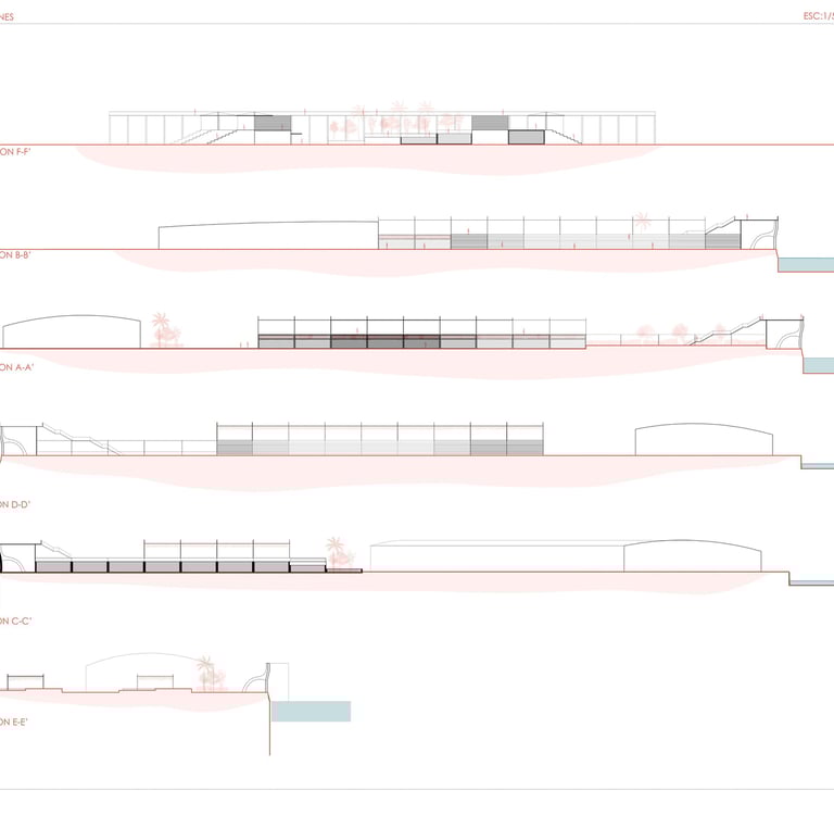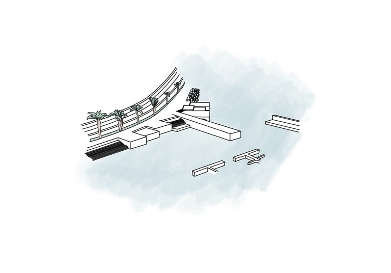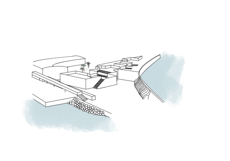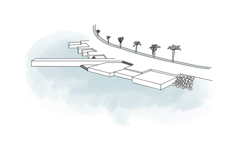 In this redesign, we aim to preserve part of the area known as ‘Los Cubos’, which is recognized for its popular use. As we approach the Club Mediterráneo, we propose greater spatial and programmatic continuity through open spaces designed for rest and contemplation, encouraging enjoyment of the coastal environment in its natural state. The height differentiation will be maintained by incorporating a beach-style tiered structure, without interfering with the sense of continuity and direct contact with the river, fostering a greater sense of belonging to the place and making the waterfront a more vibrant and visited area.