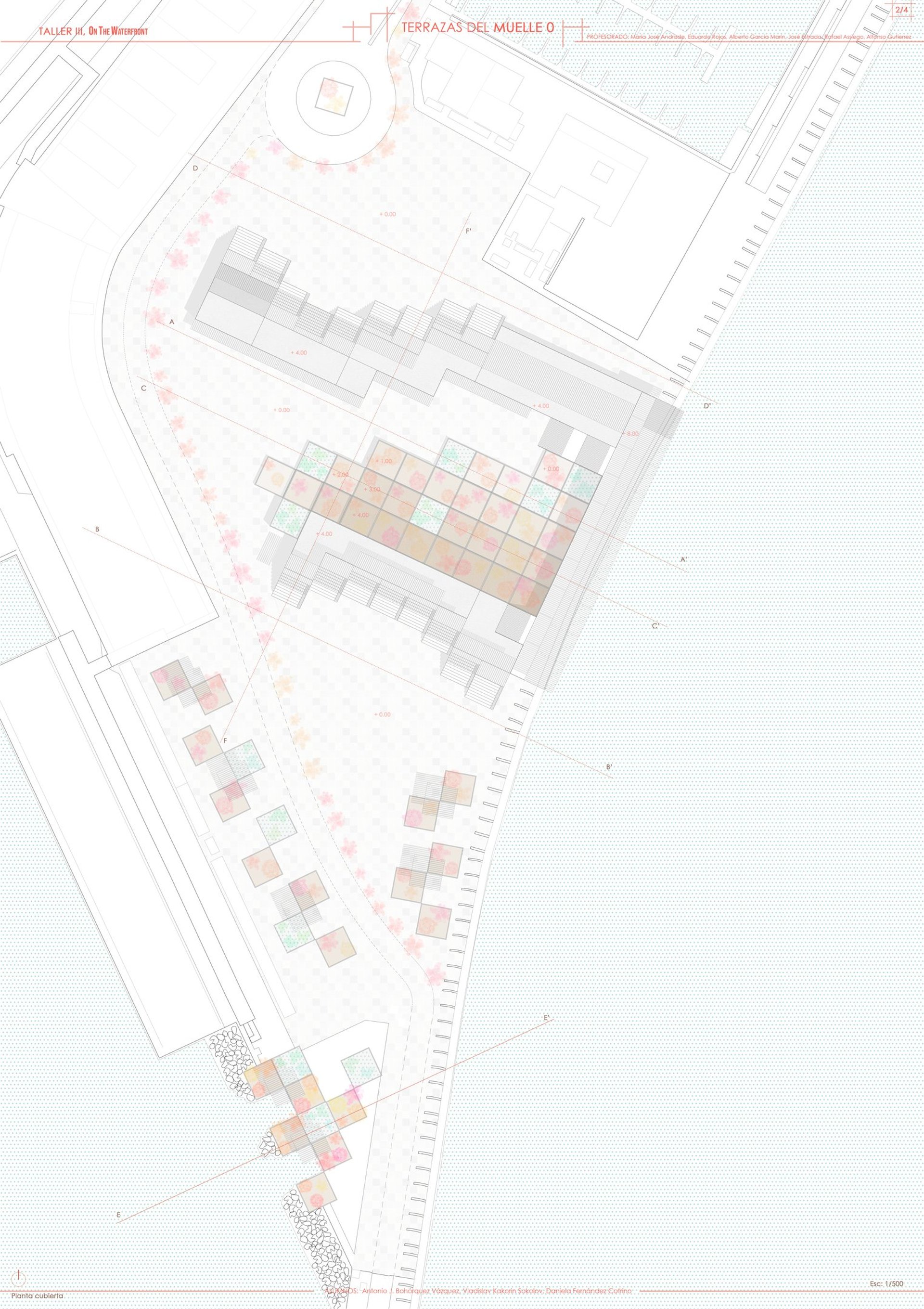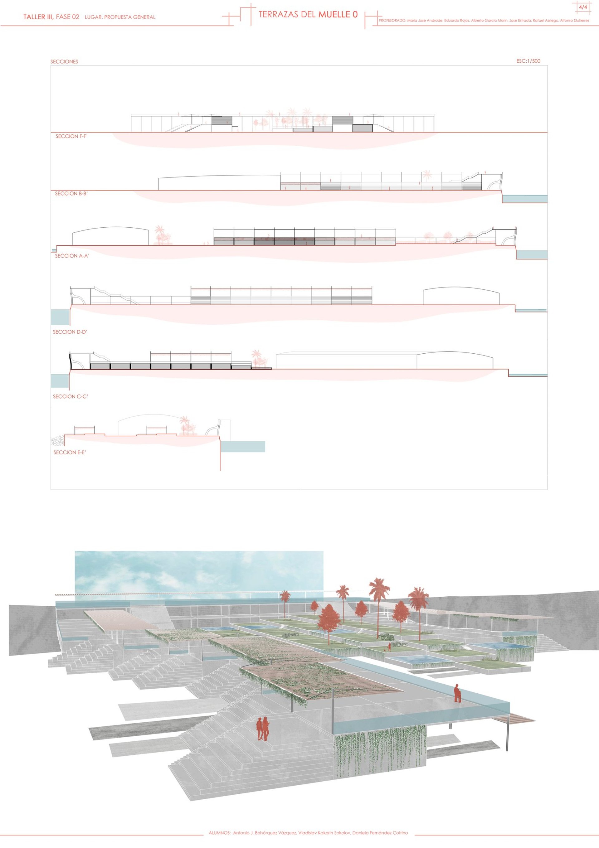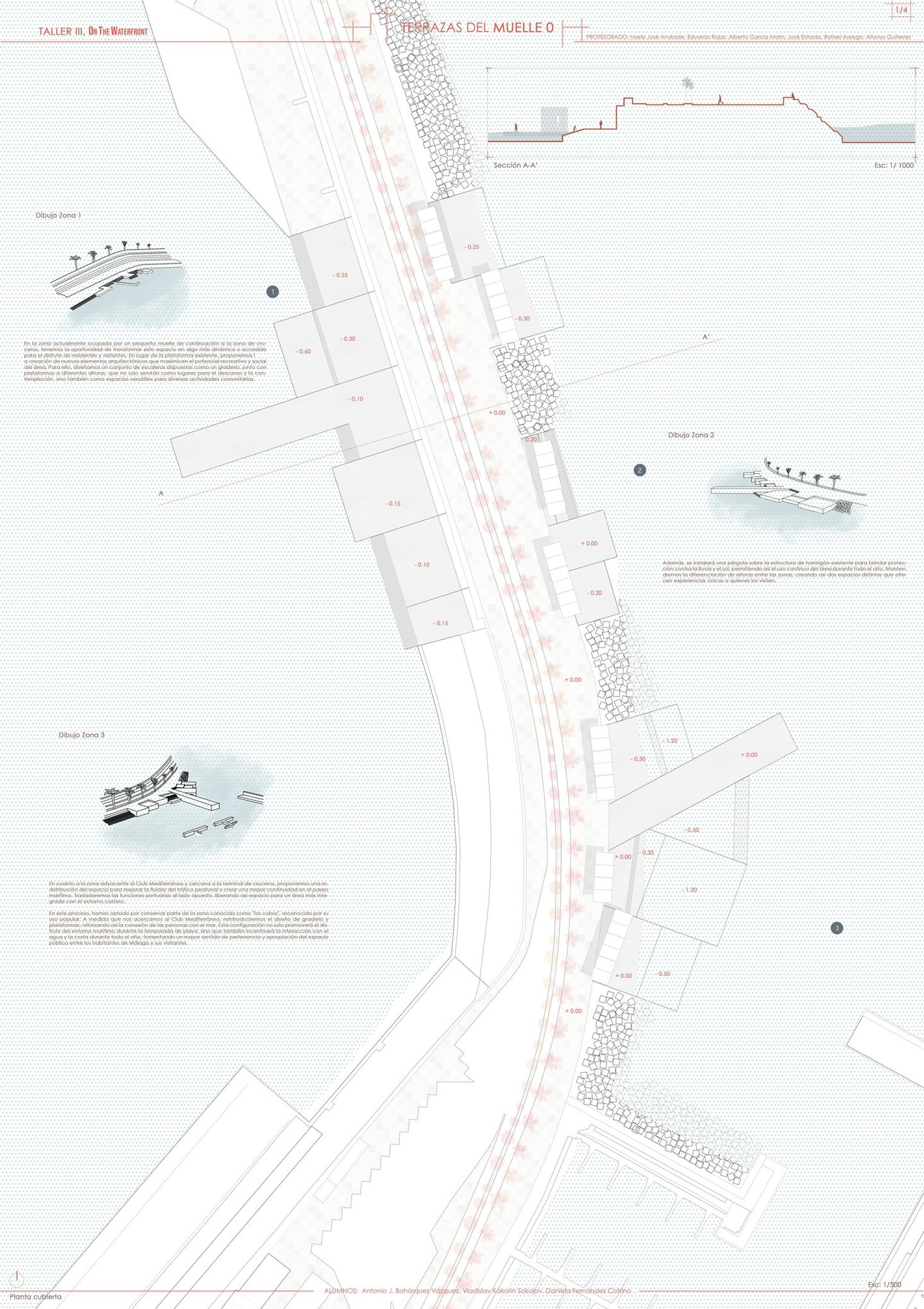 In this redesign, we aim to preserve part of the area known as ‘Los Cubos’, which is recognized for its popular use. As we approach the Club Mediterráneo, we propose greater spatial and programmatic continuity through open spaces designed for rest and contemplation, encouraging enjoyment of the coastal environment in its natural state. The height differentiation will be maintained by incorporating a beach-style tiered structure, without interfering with the sense of continuity and direct contact with the river, fostering a greater sense of belonging to the place and making the waterfront a more vibrant and visited area.
