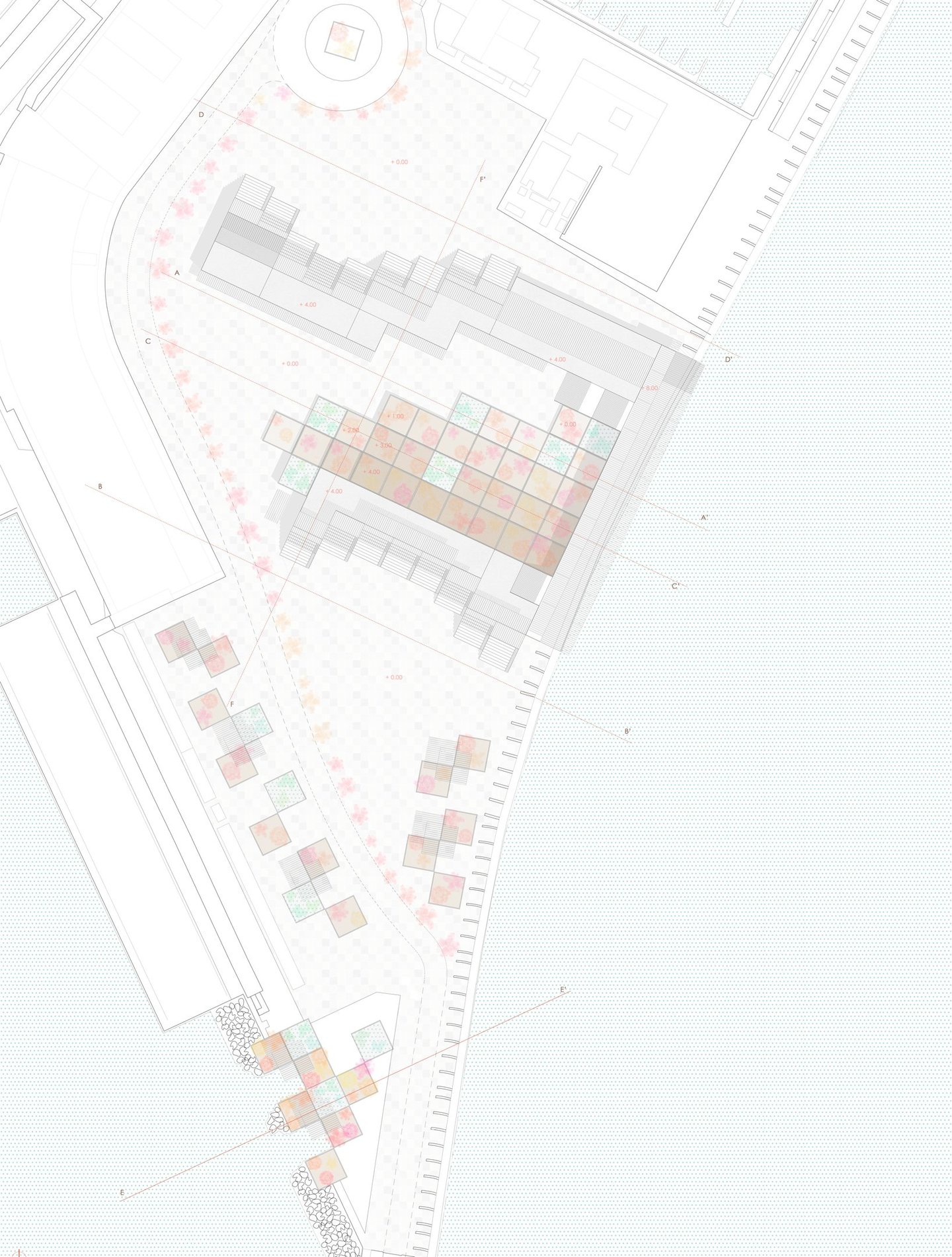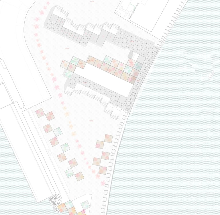 In the area currently occupied by a small extension pier of the cruise terminal, we have the opportunity to transform this space into something more dynamic and accessible for both residents and visitors. Instead of the existing platform, we propose the creation of new architectural elements that enhance the recreational and social potential of the area. To achieve this, we designed a set of three levels, stacked like a grandstand, along with platforms at different heights. These elements will not only serve as places for rest and contemplation, but also as versatile spaces for various community activities.