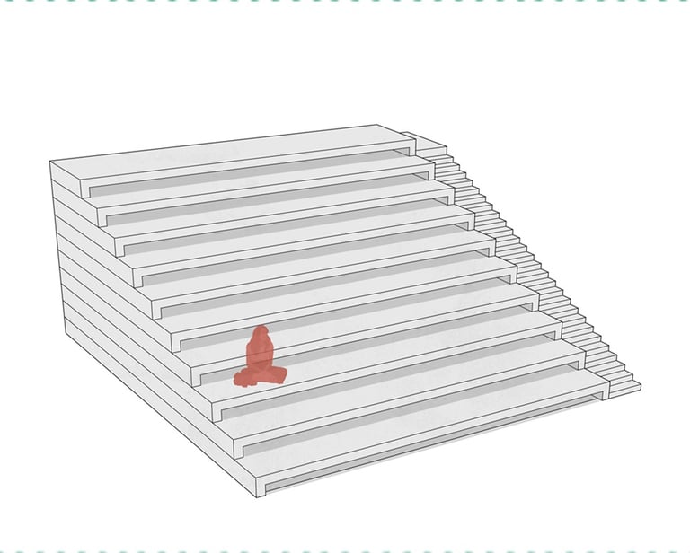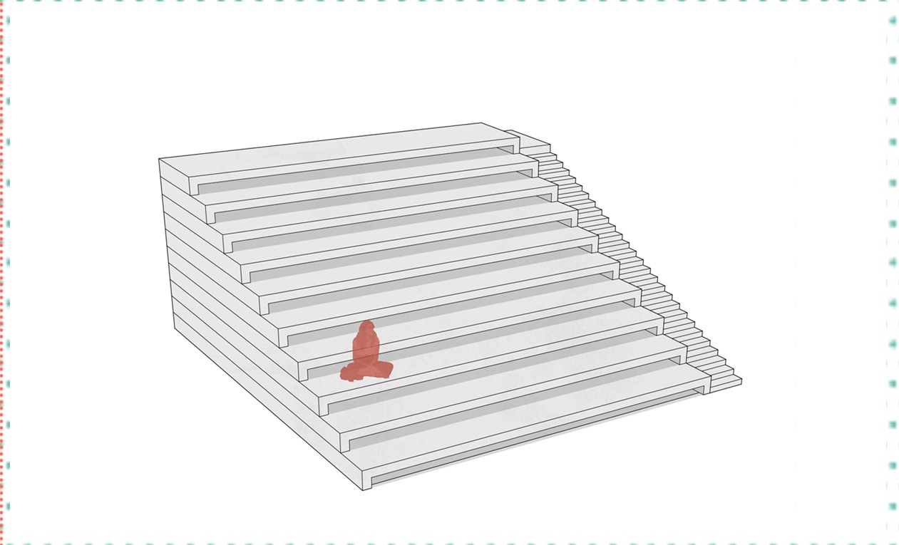 A square-tiered seating structure measuring 10x10 meters. It consists of several stepped levels and features a staircase on one side for access to the different tiers. In front of the structure, there is a human figure providing scale to its size. The seating tiers are designed to accommodate seated individuals, and the staircase facilitates movement between levels.