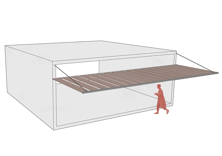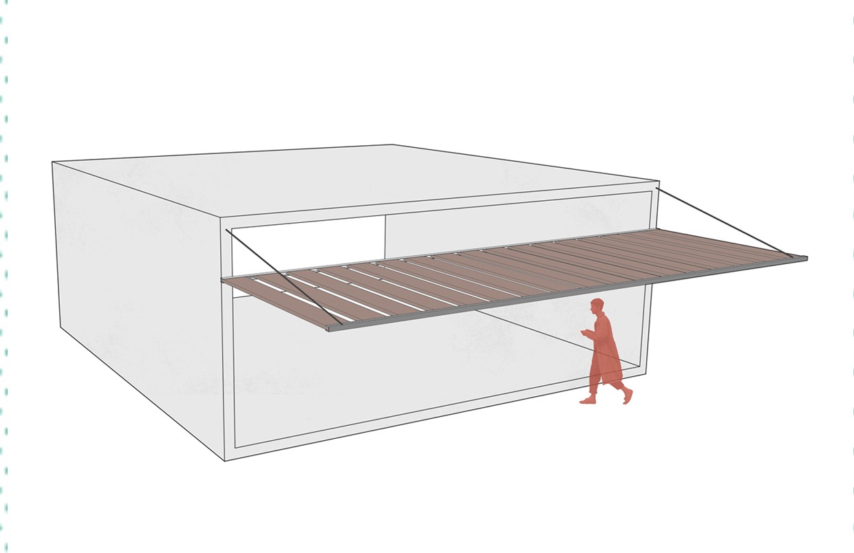A square-shaped structure measuring 10x10 meters. It is built with reinforced and prefabricated concrete. It has two supports on the sides and is equipped with a cover that allows access or ventilation. This opening occupies a significant portion of the structure's side and features a grid design that permits the entry of light and air. In front of the opening, there is a human figure providing scale to the size of the module.