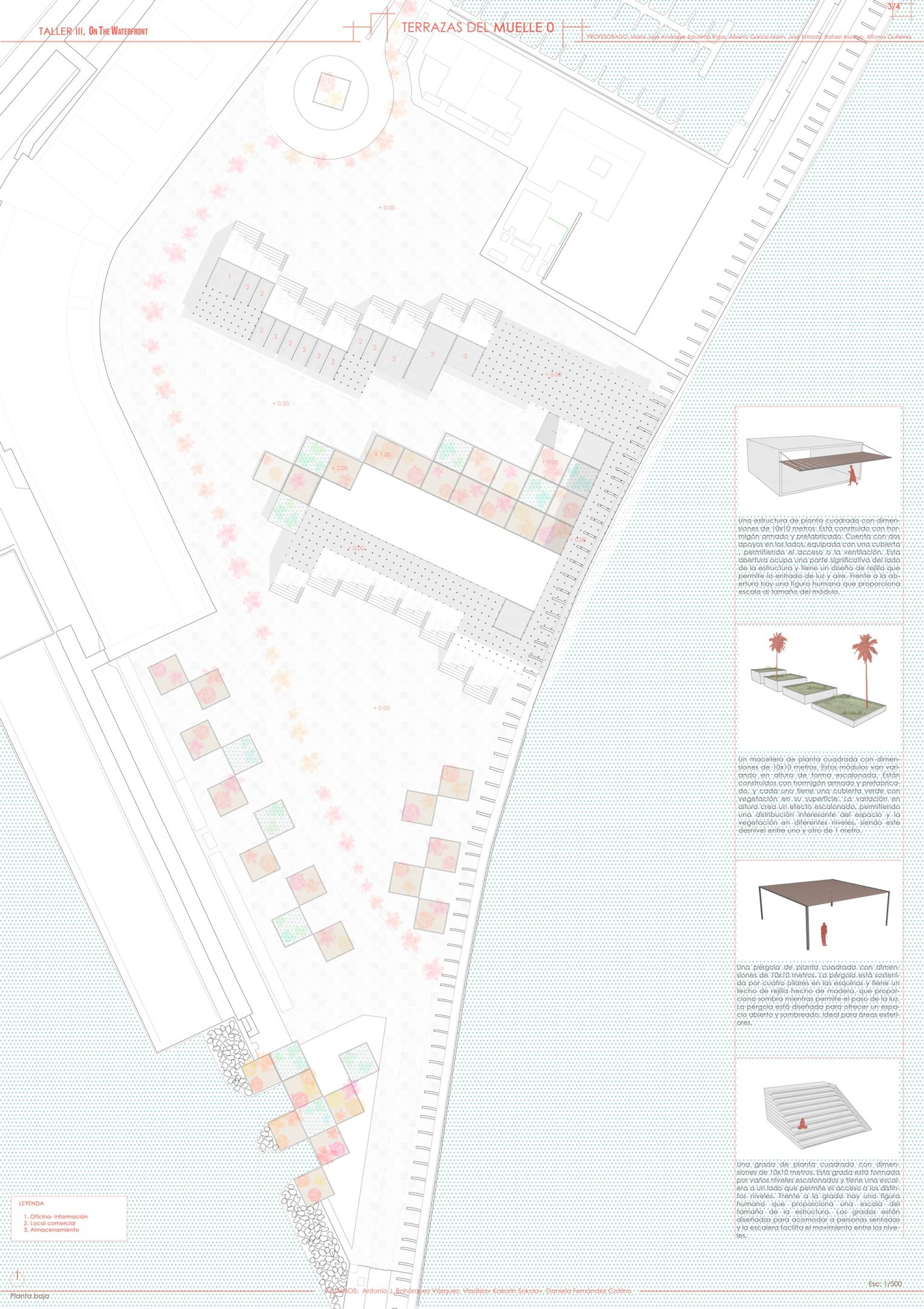 The Port of Málaga will be revitalized through the installation of multifunctional modules that will enhance the experience for both visitors and the local community. These modules, designed to serve specific functions, will provide aesthetic and functional benefits to the port environment. The planter module, dedicated to housing native plants, will improve the natural surroundings and air quality, while also offering a visually pleasant appearance. The storage module will facilitate the organization and operational efficiency of the port by allowing for the safe storage of tools and nautical equipment.