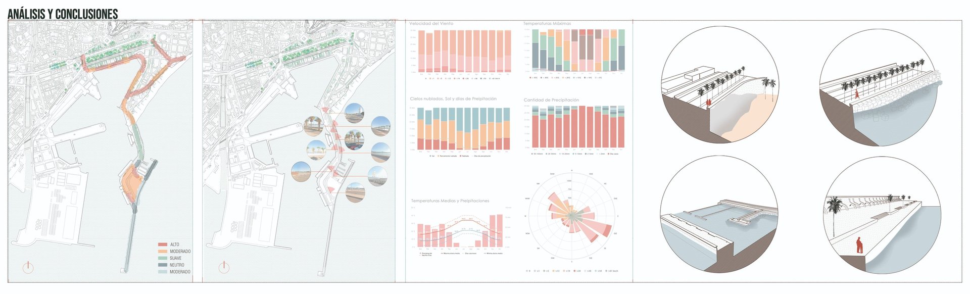 Regarding the area adjacent to the Club Mediterráneo and near the cruise terminal, we propose a revitalization of the space to improve the flow of pedestrian traffic along this coastal strip, which is currently obstructed by a series of misplaced structural elements aligned along the promenade. We will relocate the port-related functions to the opposite side, thereby freeing up space for an area more integrated with the coastal environment.