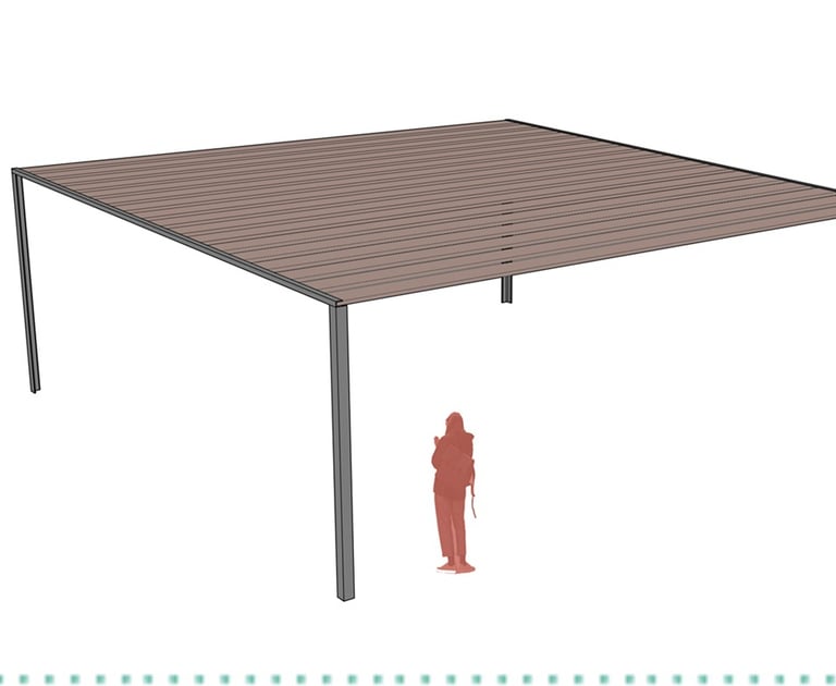 A square pergola measuring 10x10 meters. The pergola is supported by four pillars at the corners and has a wooden grid roof that provides shade while allowing light to pass through. It is designed to create an open and shaded space, ideal for outdoor areas.