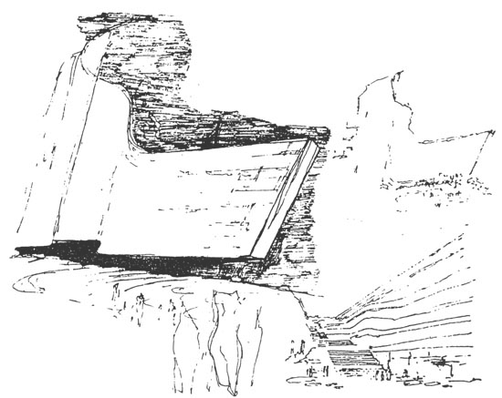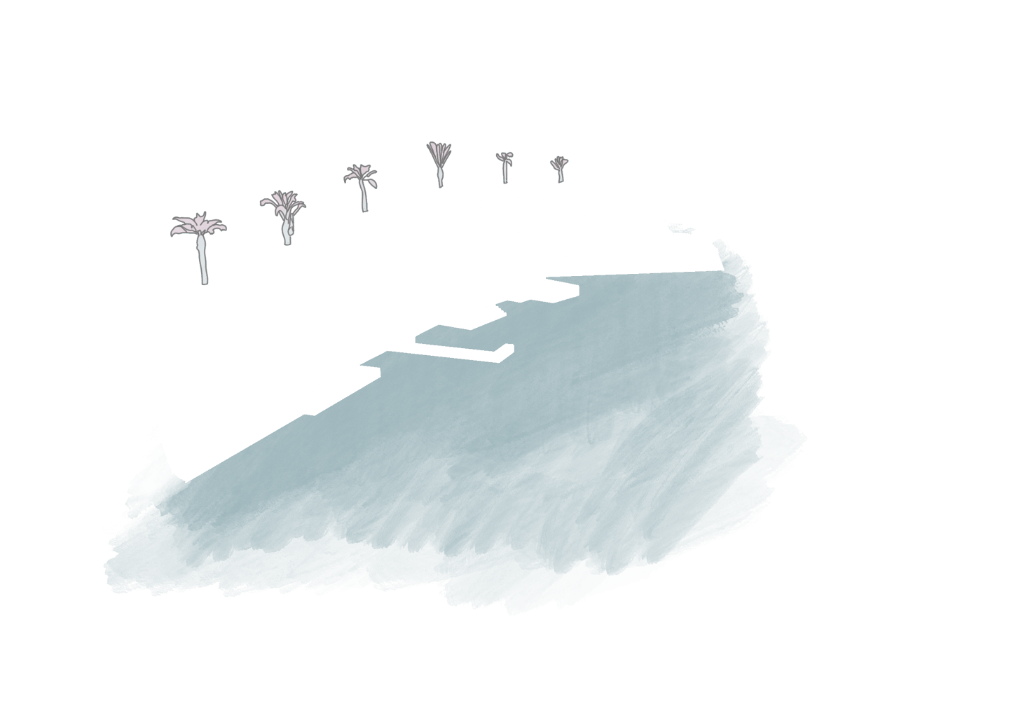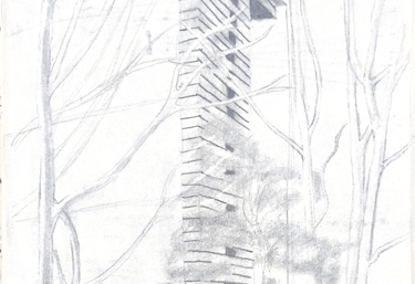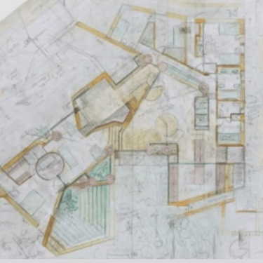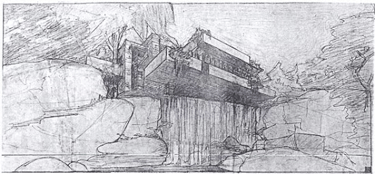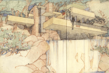 Se ve cómo utiliza el lápiz de color para enfatizar uno de los temas principales de su arquitectura: la fusión con el entorno. Wright buscó los materiales de la casa acorde con el paisaje que la rodea.