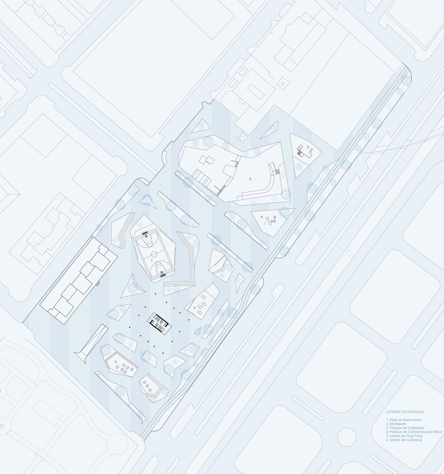 Some modules have dedicated purposes, while others function as planters. The arrangement of tilted planters creates natural terraces that provide informal seating while also acting as ventilation points for the underground parking, improving airflow.