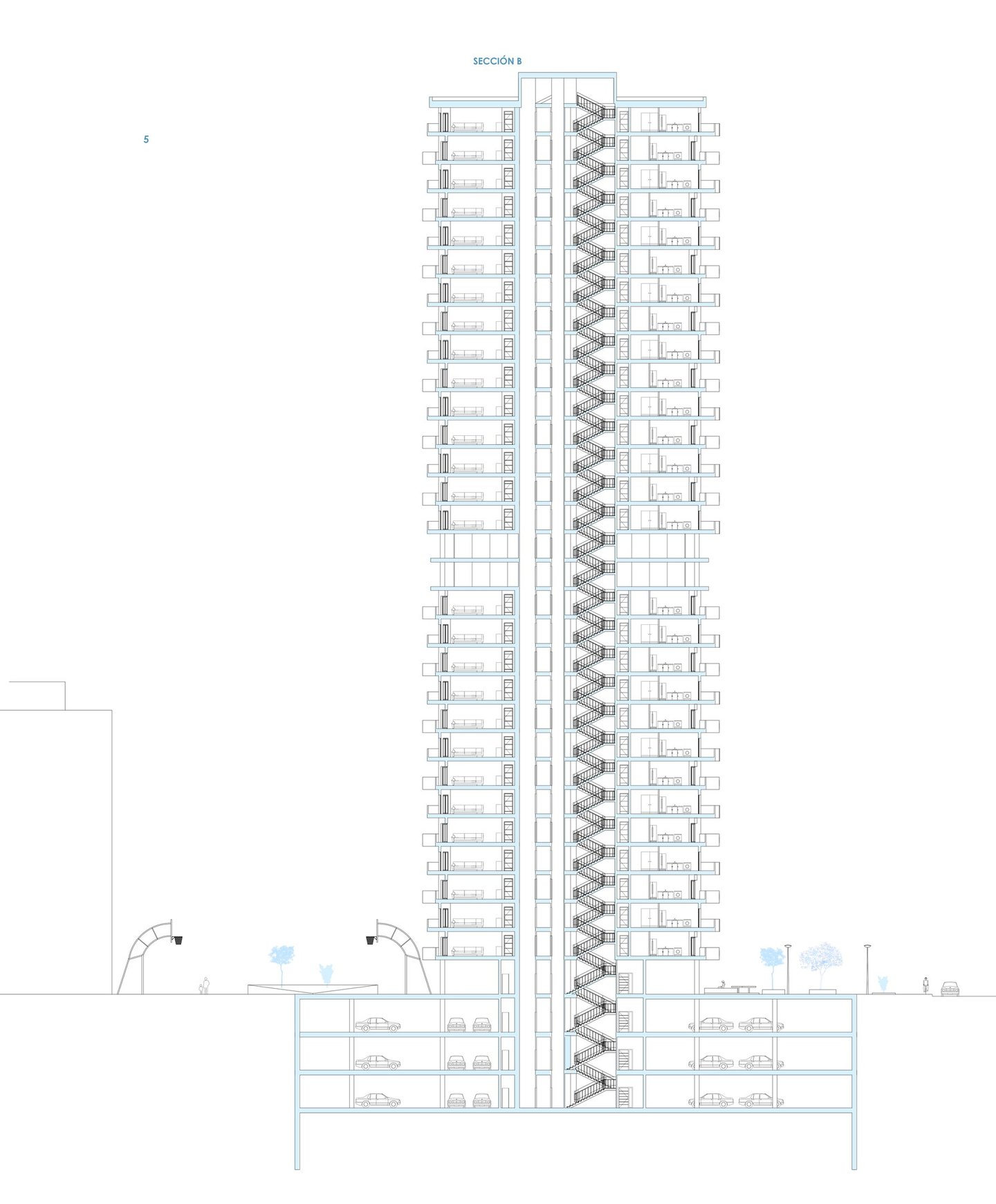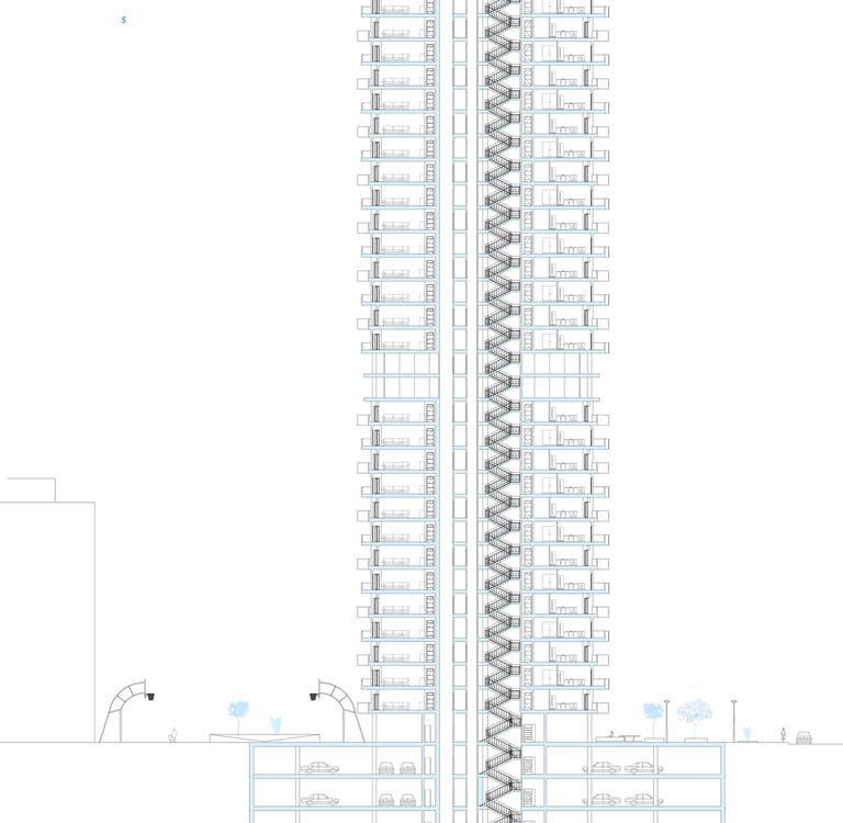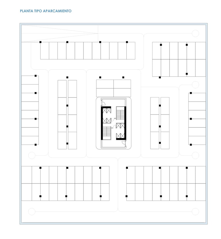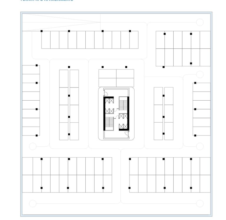 For pedestrian access, a central core connects all three parking levels to the upper floors, equipped with elevators and stairs for quick, secure movement between parking and the tower’s facilities.