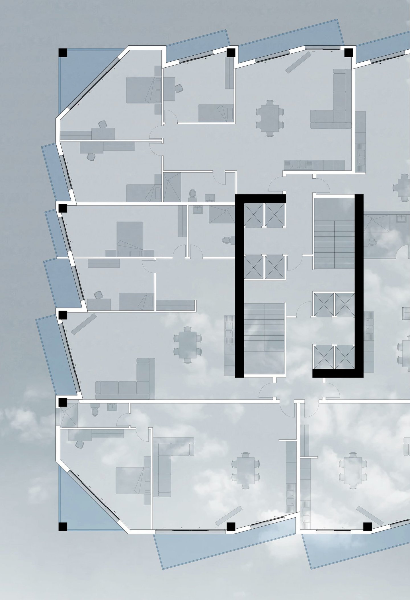 The tower’s standard floor plan features two variants, both with an efficient and elegant design. From the central core, residents access each of the six units per floor. The defining feature lies in the orientation of the perimeter terraces: one variant has clockwise-oriented terraces, while the other has counterclockwise-oriented terraces.