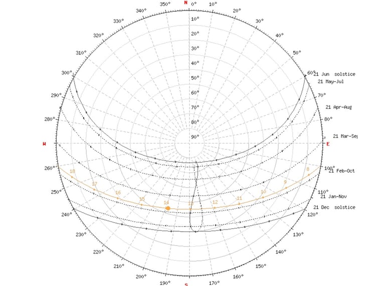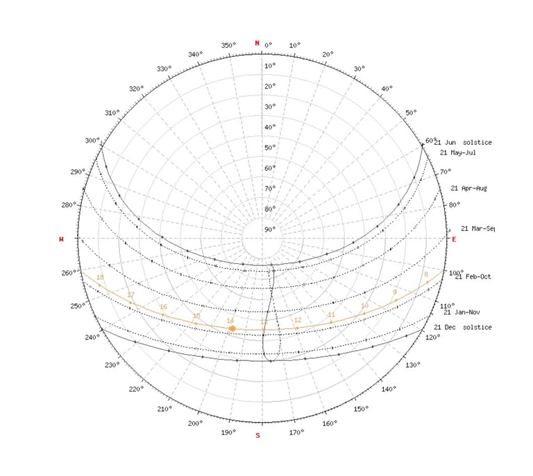 The sun's annual trajectory suggests optimizing building orientation to maximize natural daylight while reducing artificial energy consumption. This is particularly critical for window placement, enabling efficient solar energy utilization.