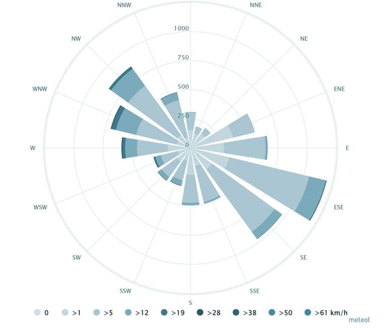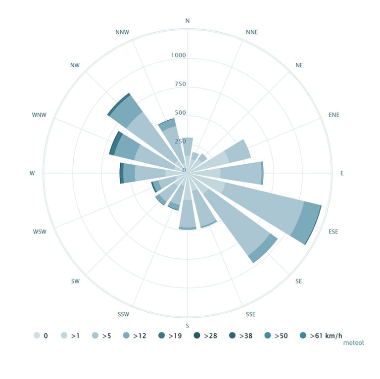 The prevailing southeast winds necessitate reinforced structures on wind-exposed facades. This analysis further recommends installing natural or artificial windbreaks to mitigate wind impact while maintaining optimized cross-ventilation throughout the buildings.