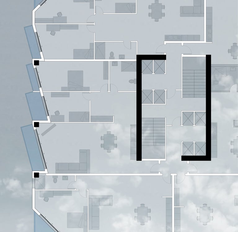 The central core of the tower serves as its structural backbone, housing critical building systems such as elevators, staircases, and service utilities. This central element provides stability and resistance against both vertical and lateral loads, ensuring the building’s structural integrity.